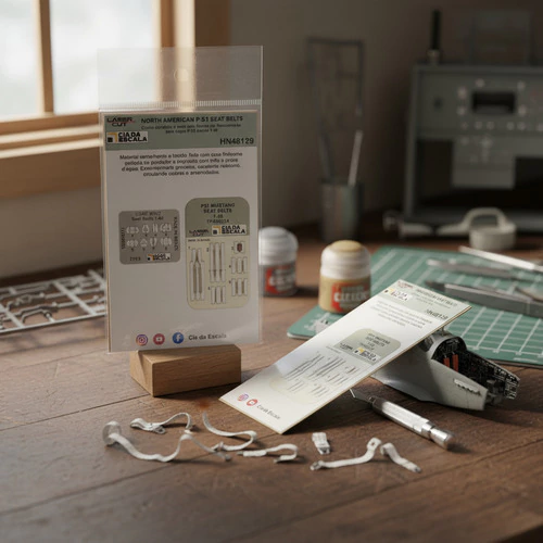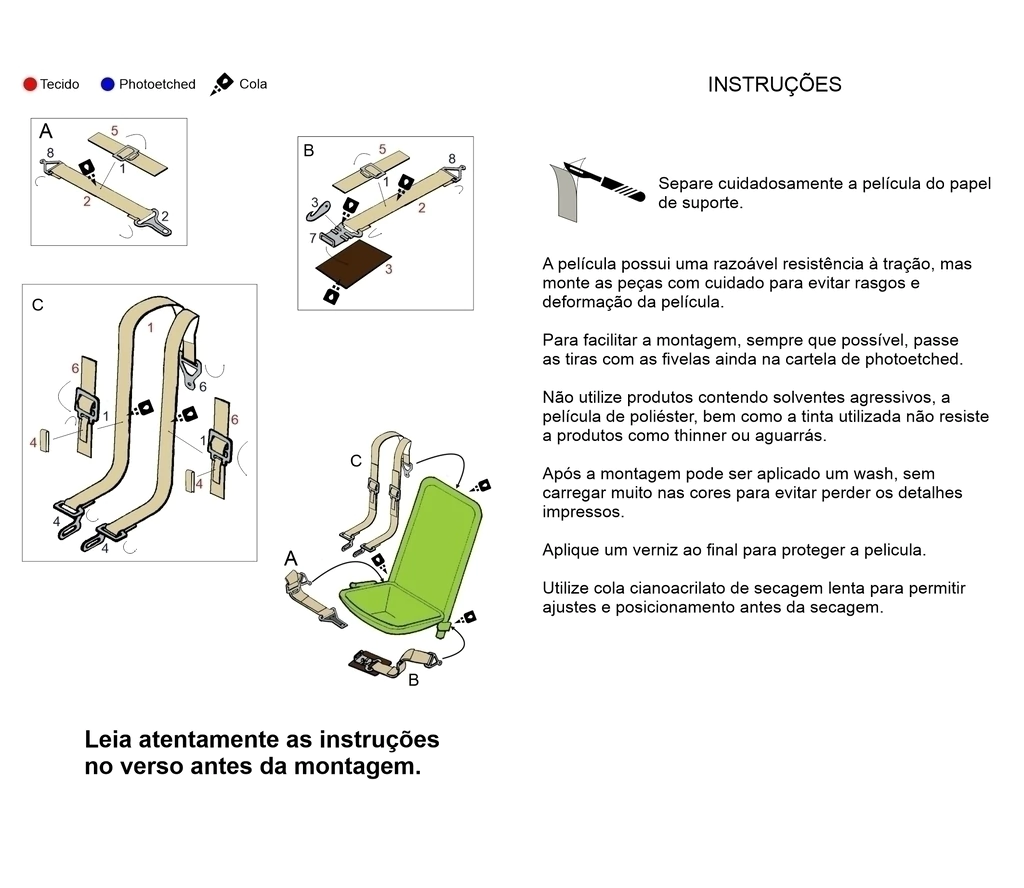 Proporciona um realismo superior aos cintos confeccionados em fotocorrosão, pois permite efeitos de amarrotamento e dobras. Fivelas em aço inox.